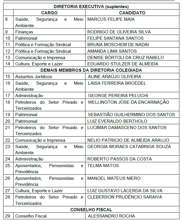 O propósito da presente reunião, conforme Regimento Eleitoral, emitir juízo de homologação da inscrição da única chapa que apresentou documentos para o processo eleitoral definidor dos membros da Diretoria Colegiada e do Conselho Fiscal do Sindicato dos Petroleiros do Espírito Santo – SINDIPETRO/ES. Assim, verificou-se que o único pedido de inscrição foi realizado pela Chapa denominada “A Luta Continua”. Analisados todos os requisitos e documentos exigidos no Estatuto da entidade e no Regimento Eleitoral, os membros da Comissão Eleitoral concluíram estarem preenchidos e presentes, e, no exercício de suas atribuições estatutárias e regimentais, decidiram HOMOLOGAR o pedido de inscrição da Chapa denominada “A Luta Continua” composta pelos seguintes membros: